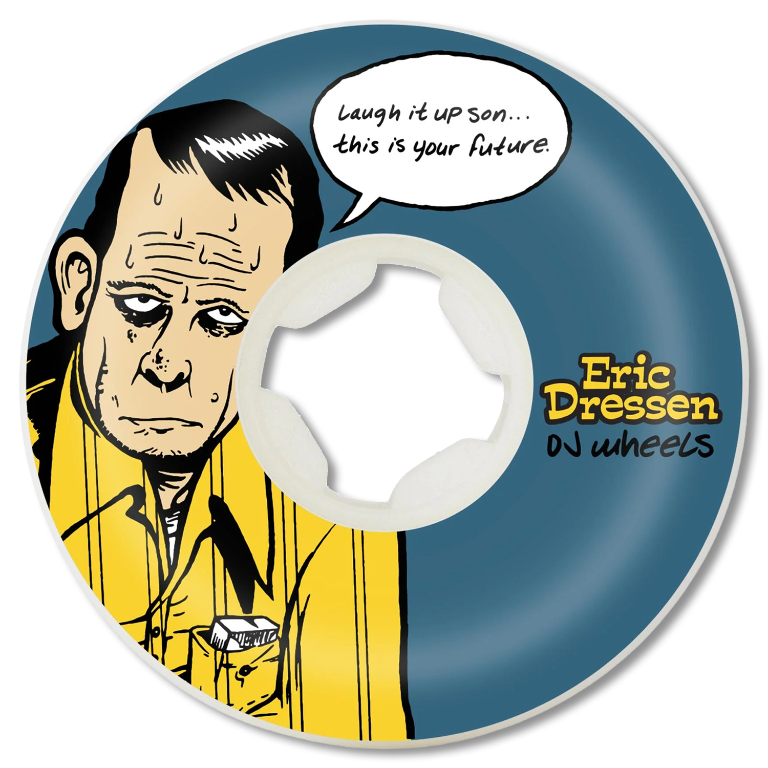 OJ Wheels 58mm, 99a Eric Dressen Laugh it Up Original Pro Hardlines white with reissue graphics from his mid 90s Santa Cruz deck.